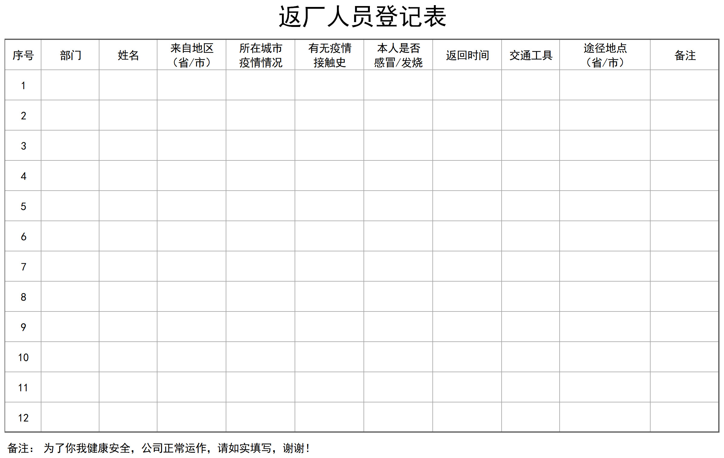 以上《返廠人員登記表》表格下載后支持自定義編輯,可視公司具體情況添補(bǔ)登記項(xiàng),于企事業(yè)單位范圍內(nèi)對(duì)肺炎疫情進(jìn)行科學(xué)的管理把控。