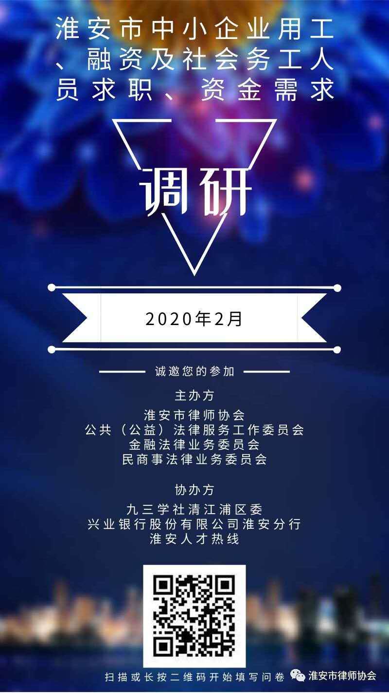 5、本調(diào)研問卷由淮安市律師協(xié)會(huì)理事會(huì)公共(公益)法律服務(wù)委員會(huì)、金融法律業(yè)務(wù)委員會(huì)、民商法律業(yè)務(wù)委員會(huì)發(fā)起,九三學(xué)社清江浦區(qū)委、興業(yè)銀行股份有限公司淮安分行、淮安贏夏人力資源有限公司(淮安人才熱線)予以技術(shù)支持共同制作。