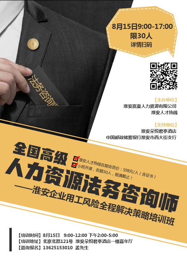 亡羊補牢,猶未為晚!讓我們走進系統(tǒng)學(xué)習(xí)的課堂——《全國高級人力資源法務(wù)咨詢師》研修班,掌握更多實戰(zhàn)技巧、消除諸多用工風(fēng)險,切實幫助企業(yè)實現(xiàn)輕松用人,解決企業(yè)用工過程中的各類風(fēng)險問題。
