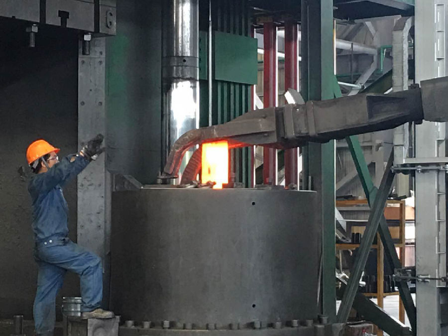 模鍛崗位員工正在指揮取料機(jī)將鍛件準(zhǔn)確投放進(jìn)模具